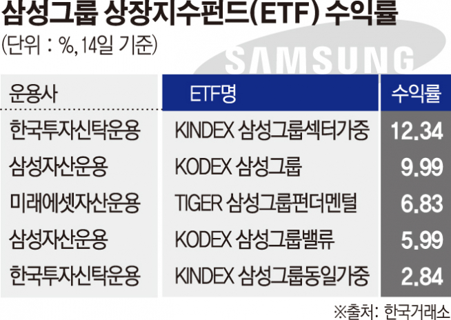17일 한국거래소에 따르면 연초 이후 삼성그룹 주식을 기초자산으로 하는 ETF 5종목 순자산이 직전 거래일 기준 총 4880억 원 늘었다. 이에 따라 삼성그룹 ETF 순자산 총액은 총 37.34% 늘어난 1조7944억 원을 기록했다.