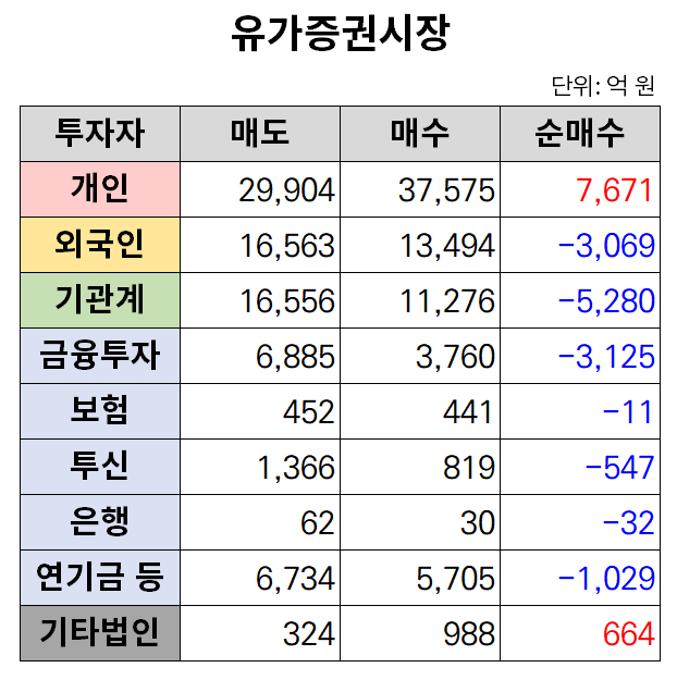 이날 기관과 외국인 투자자는 각각 5280억 원, 3069억 원어치를 순매도했다. 반면 개인은 7671억 원어치를 사들였다.