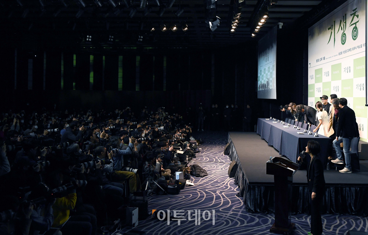영화 ‘기생충’으로 세계 최고 권위의 영화 시상식인 미국 아카데미 시상식에서 작품상 등 4관왕을 차지한 봉준호 감독과 배우, 제작진이 19일 서울 중구 소공로 웨스틴조선호텔에서 열린 기자간담회에서 인사하고 있다.