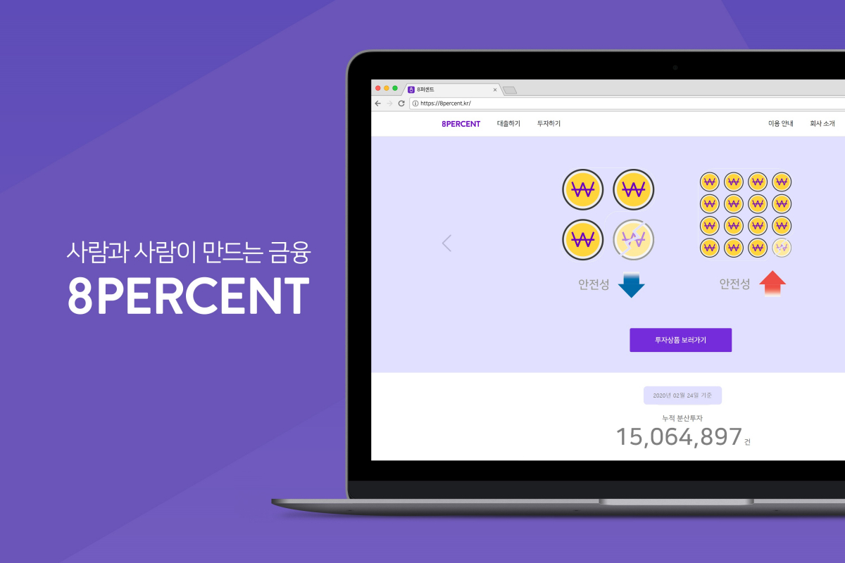 8퍼센트는 은행 대출을 받지 못하는 사회 초년생이나 중신용자들이 20% 이상의 고금리 대출을 이용하는 문제점 해결과 저금리 시대 대안 투자처를 발굴하려는 의지로 사업을 시작했다. 현재까지 170억 원 이상의 이자 비용 절감 기회를 제공했고, 8퍼센트를 이용한 중소벤처기업과 소상공인들은 5000명 이상 고용을 늘렸다. 창립 7년 차를 맞이한 8퍼센트의 24일 현재 누적 취급액은 2944억 원이며 취급대출 건수는 22340만 건, 분산투자 1506만 건, 연체율 5.73%, 플랫폼 회원수 901062 명을 기록 중이다.