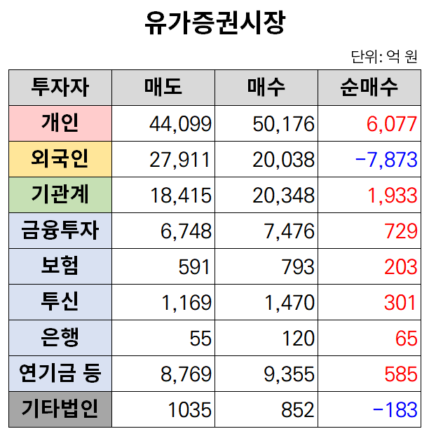 이날 외국인은 홀로 7873억 원어치 매물을 쏟아내며 지수 하락을 이끌었다. 반면 개인과 기관은 각각 6077억 원, 1933억 원어치를 순매수했다.