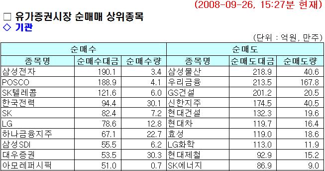 종목별로 기관들은 유가증권시장에서 삼성전자 190억원, POSCO 188억원, SK텔레콤 121억원, 한국전력 94억원 순으로 순매수세를 보였고 삼성물산 218억원, 우리금융 213억원, GS건설 20억원, 신한지주 17억원 순으로 순매도세를 나타냈다.