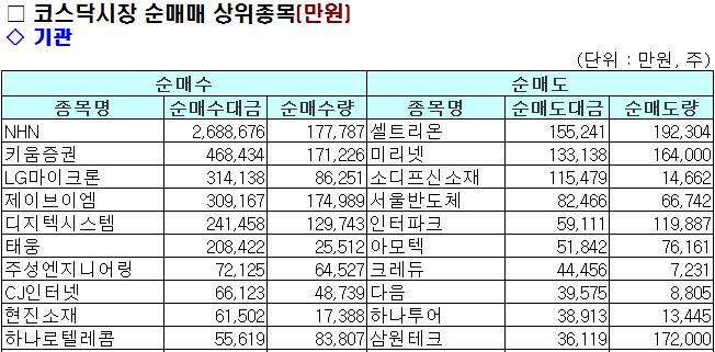 코스닥시장에서는 NHN 268억원, 키움증권 46억원, LG마이크론 31억원, 제이브이엠 30억원 순으로 순매수세를 나타냈고 셀트리온 15억원, 미리넷 13억원, 소디프신소재 11억원, 서울반도체 8억원 순으로 순매도했다.