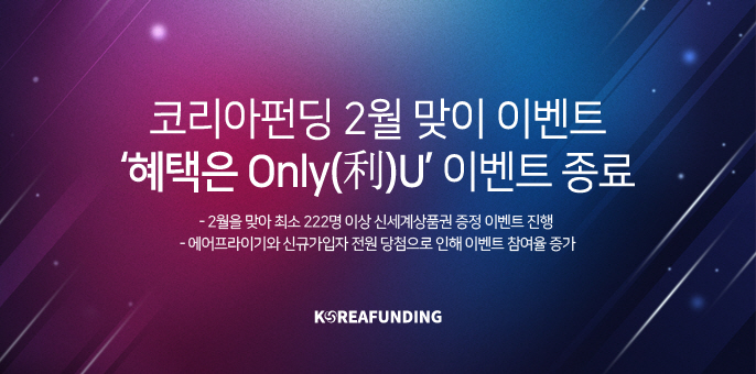 장외주식 전문 P2P기업 코리아펀딩은 '2월 혜택은 Only(利)U' 이벤트가 마무리됐다고 25일 밝혔다.