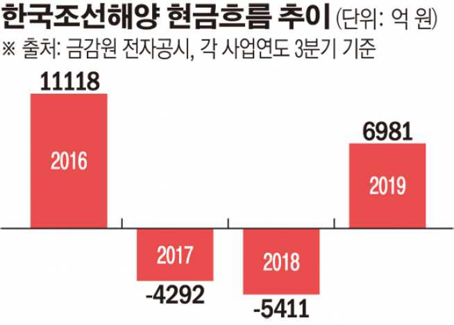 지난해 3분기까지 한국조선해양의 순현금흐름은 6981억 원으로 전년 동기 대비 플러스 전환했다. 분기별로 봐도 3225억 원, 1693억 원, 2063억 원 등 꾸준히 현금이 유입됐다.