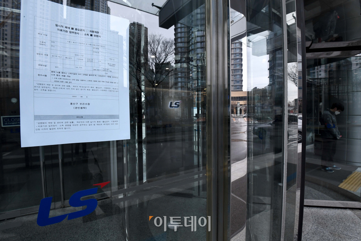 25일 서울 용산구 LS용산타워에 신종 코로나바이러스 감염증(코로나19) 확진자 발생으로 인한 임시폐쇄 안내문이 붙어 있다. LS그룹은 LS타워에 입주한 LS·LS니꼬동제련 등 계열사 임직원에게 26일까지 재택근무할 것을 명령했다.