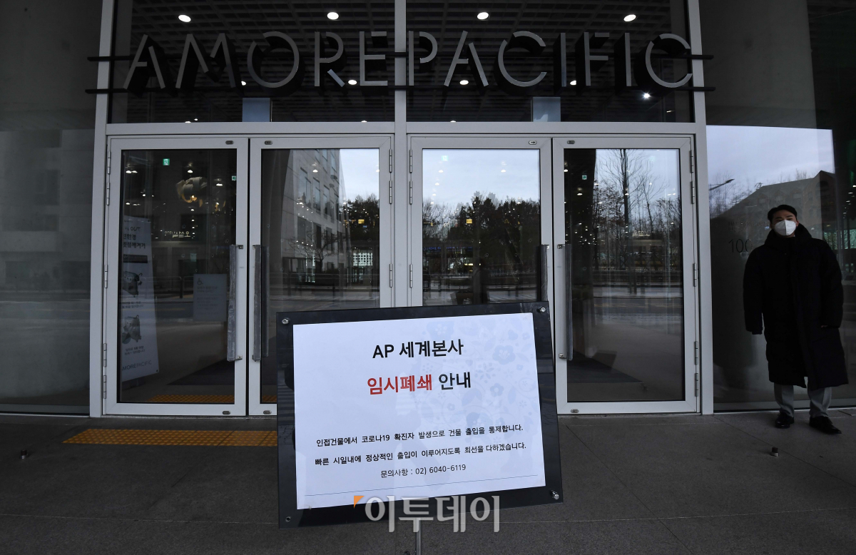25일 서울 용산구 아모레퍼시픽 본사 입구에 인접건물 신종 코로나바이러스 감염증(코로나19) 확진자 발생으로 인한 임시폐쇄 안내문이 게시돼 있다. 아모레퍼시픽은 바로 옆 LS용산타워에서 코로나19 확진자가 발생해 본사 전 직원에게 재택근무를 명령했다.