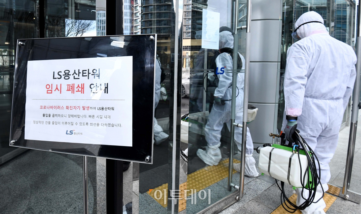 25일 서울 용산구 LS용산타워가 신종 코로나바이러스 감염증(코로나19) 확진자 발생으로 임시 폐쇄된 가운데 방역업체 관계자들이 방역을 위해 건물로 들어서고 있다. LS그룹은 LS타워에 입주한 LS·LS니꼬동제련 등 계열사 임직원에게 26일까지 재택근무할 것을 명령했다.