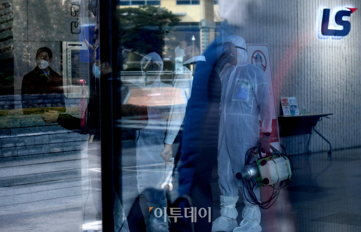 25일 서울 용산구 LS용산타워가 신종 코로나바이러스 감염증(코로나19) 확진자 발생으로 임시 폐쇄된 가운데 방역업체 관계자들이 방역을 위해 건물로 들어서고 있다. LS그룹은 LS타워에 입주한 LS·LS니꼬동제련 등 계열사 임직원에게 26일까지 재택근무할 것을 명령했다.