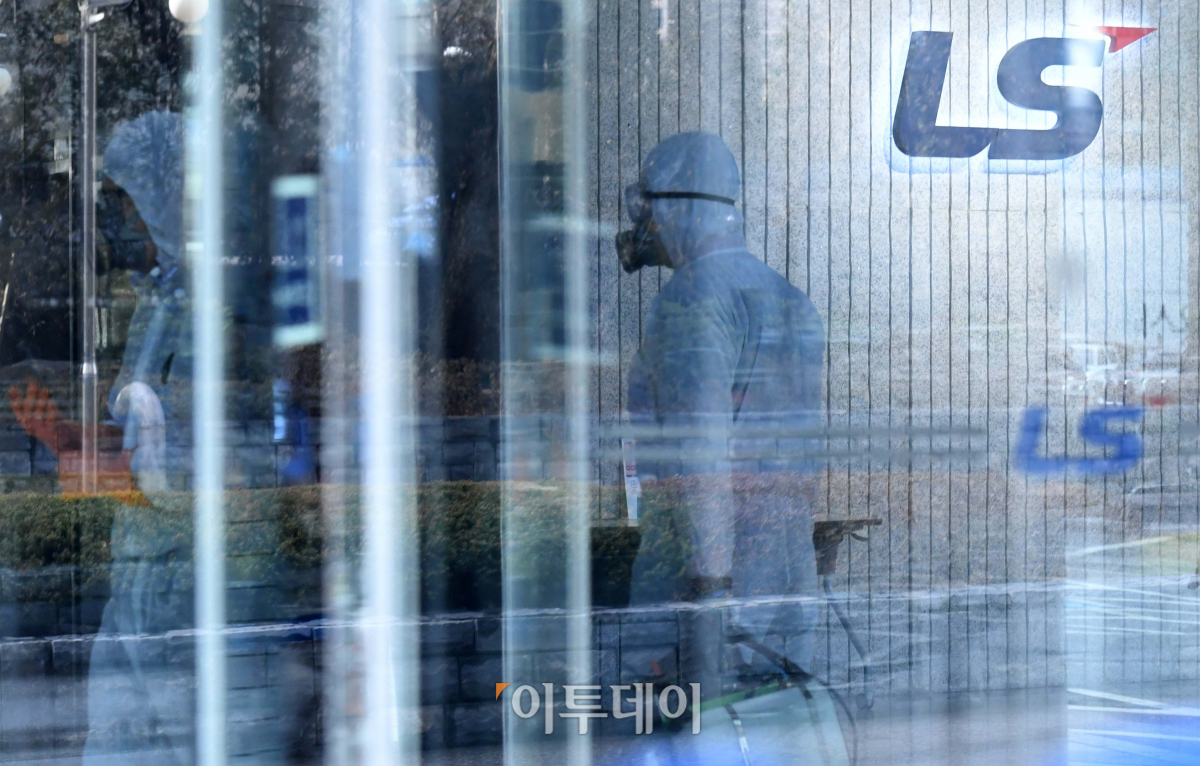25일 서울 용산구 LS용산타워가 신종 코로나바이러스 감염증(코로나19) 확진자 발생으로 임시 폐쇄된 가운데 방역업체 관계자들이 방역을 위해 건물로 들어서고 있다. LS그룹은 LS타워에 입주한 LS·LS니꼬동제련 등 계열사 임직원에게 26일까지 재택근무할 것을 명령했다.