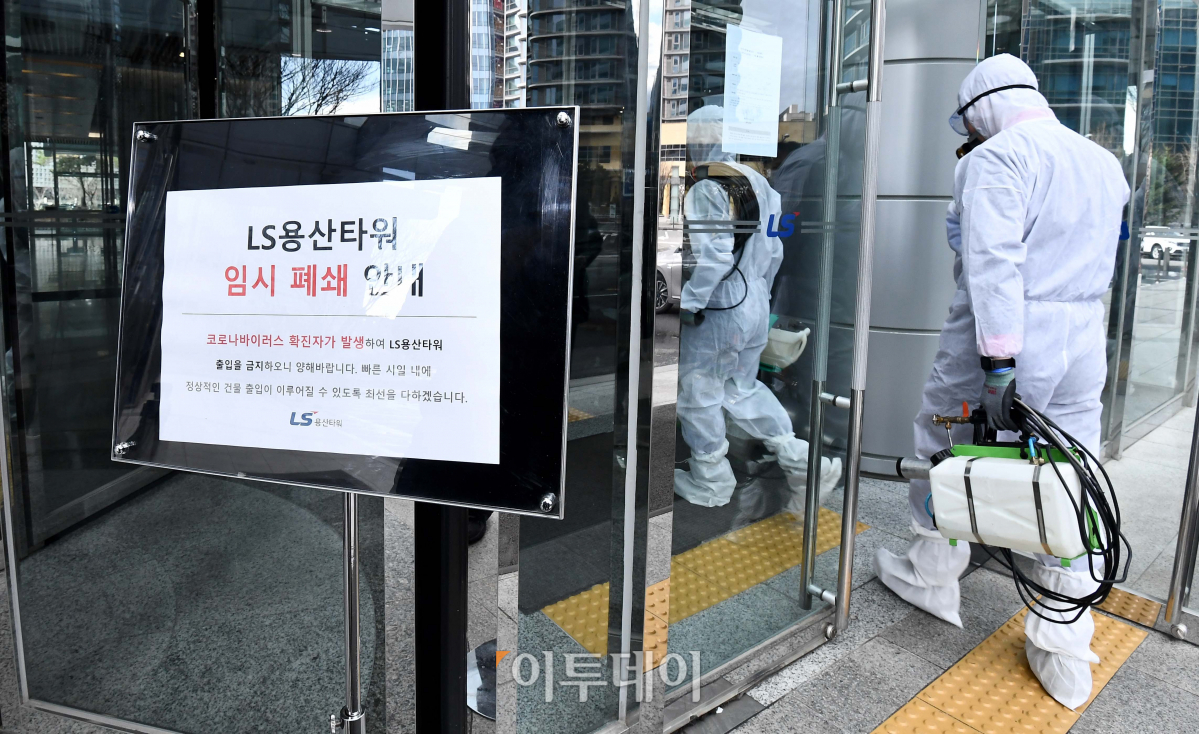 25일 서울 용산구 LS용산타워가 신종 코로나바이러스 감염증(코로나19) 확진자 발생으로 임시 폐쇄된 가운데 방역업체 관계자들이 방역을 위해 건물로 들어서고 있다. LS그룹은 LS타워에 입주한 LS·LS니꼬동제련 등 계열사 임직원에게 26일까지 재택근무할 것을 명령했다.