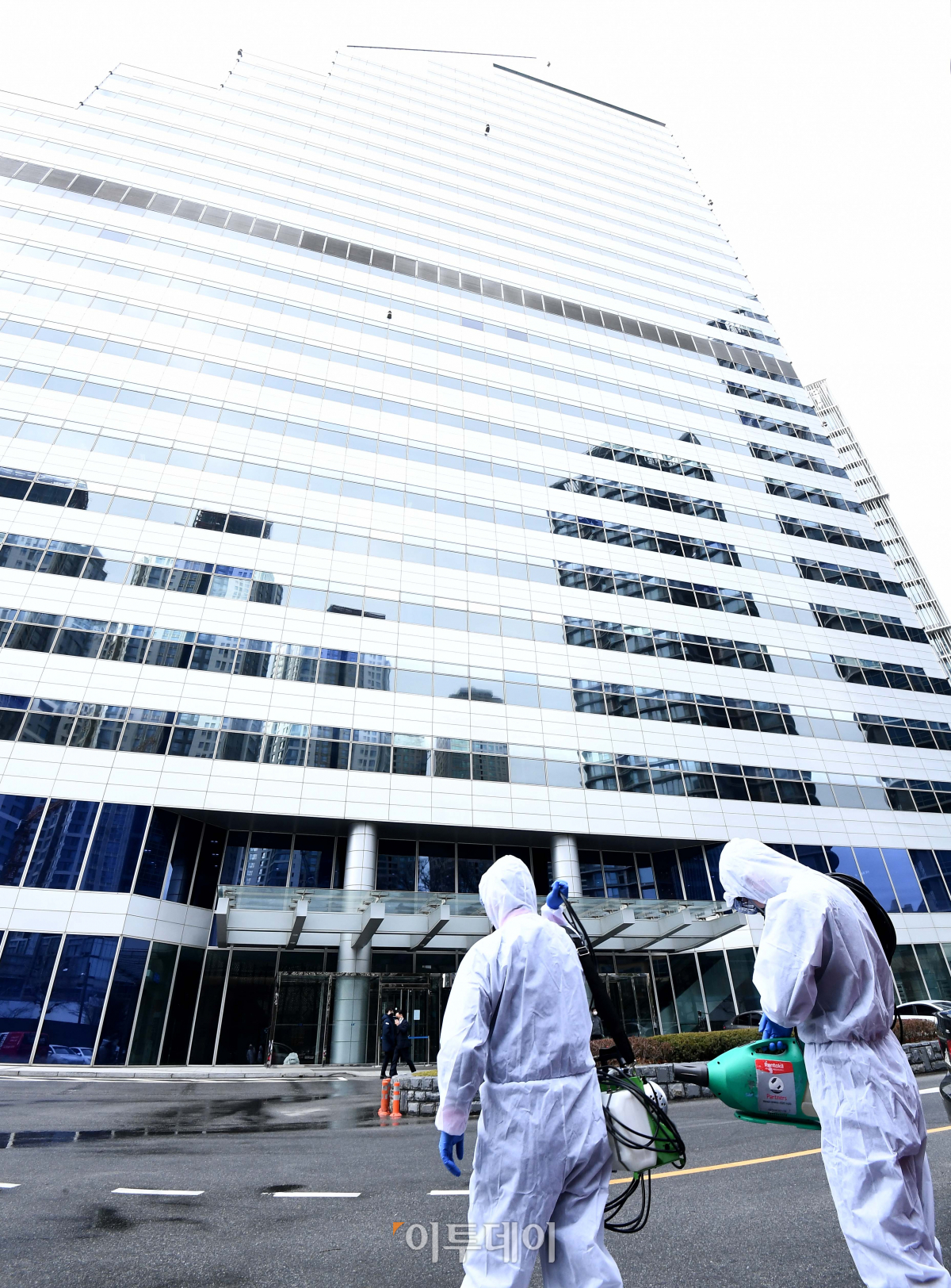 25일 서울 용산구 LS용산타워가 신종 코로나바이러스 감염증(코로나19) 확진자 발생으로 임시 폐쇄된 가운데 방역업체 관계자들이 방역을 위해 건물로 들어서고 있다. LS그룹은 LS타워에 입주한 LS·LS니꼬동제련 등 계열사 임직원에게 26일까지 재택근무할 것을 명령했다.