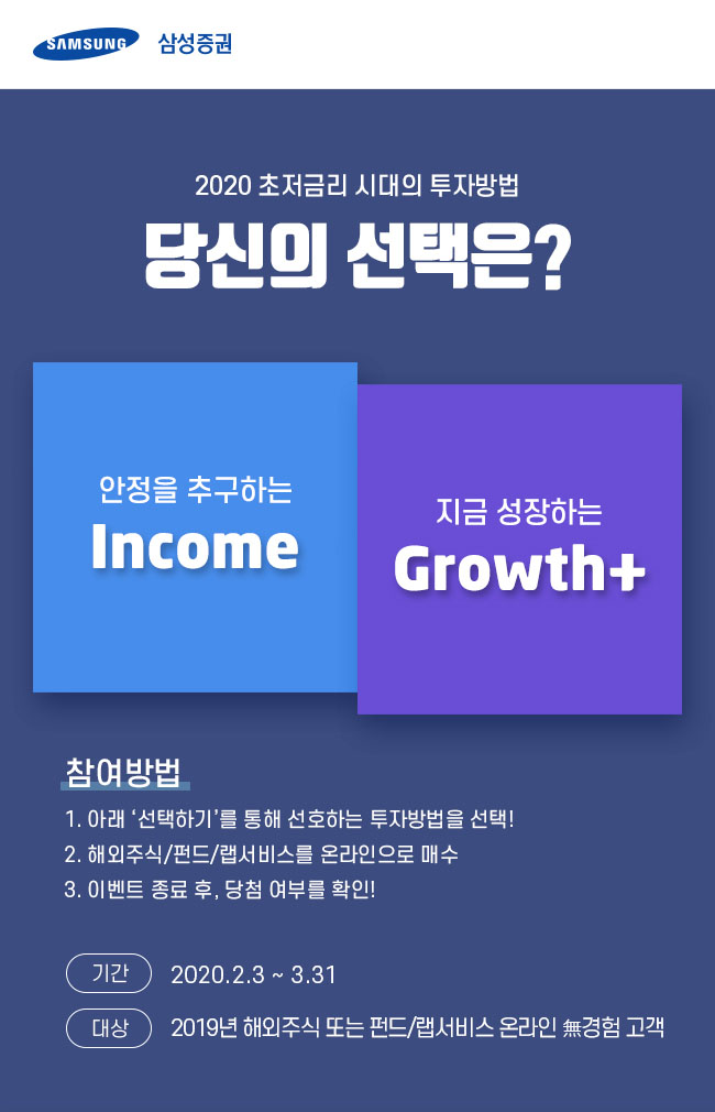 삼성증권이 연초 '초저금리' 시대의 장기화에 따라 제시한 투자 키워드인 'Income'과 ‘Growth ’에 대한 고객의 관심이 높아짐에 따라 관련 이벤트를 3월 말까지 진행한다고 27일 밝혔다.