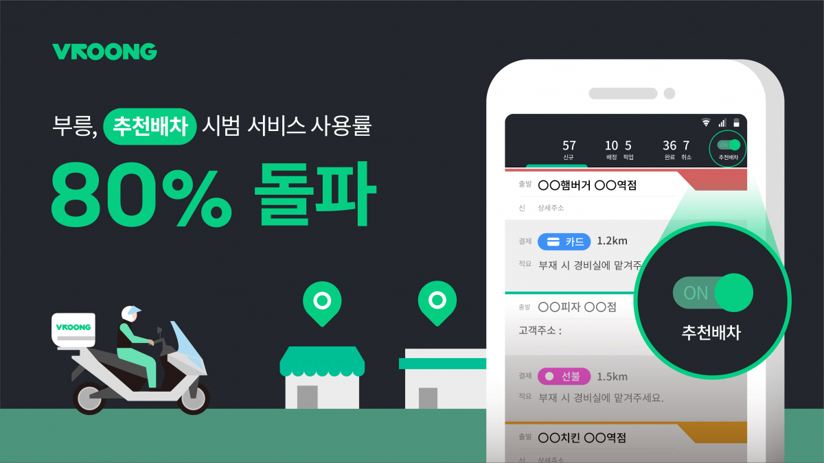 메쉬코리아는 지난해 8월 일부 지역에서 라이더가 추천된 배송 주문을 자동 수락해 수행하는 추천배차 시범 서비스를 시작했으며, 올해 들어 그 사용률이 꾸준히 상승하면서, 2월 둘째주에 80%를 넘겼다. 부릉 라이더가 수행한 배송 10건 중 8건이 추천배차를 통한 배송인 셈이다.