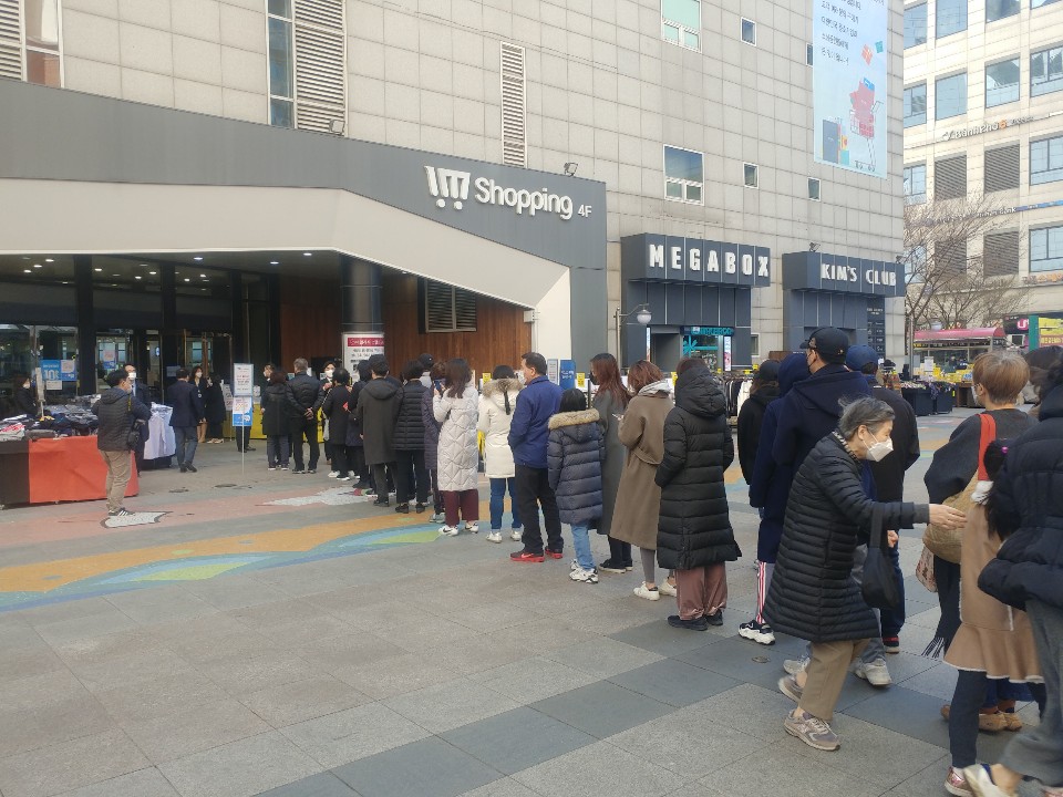 27일 목동 행복한백화점에 판매 전부터 마스크를 사려는 사람들이 길게 줄을 서 있다.