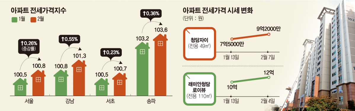 지난해 발표된 12·16 부동산 대책 이후 서울 아파트 매매값은 상승세가 한풀 꺾인 분위기지만 전셋값은 상승 조짐을 보이고 있다. 새학기를 앞두고 강남지역을 중심으로 전세수요가 몰리고 있는데 따른 것이다. 문제는 앞으로 재건축 사업으로 인한 이주 수요까지 쏟아질 경우 전세시장 불안이 가중될 수 있다는 점이다.