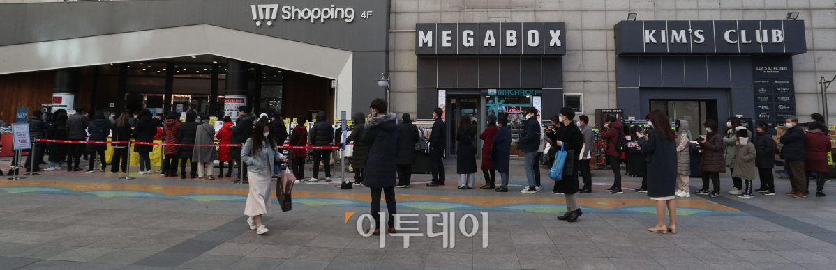 27일 서울 양천구 목동동로 행복한백화점에서 시민들이 줄지어 마스크를 구매하기 위해 줄지어 서있다. 중소벤처기업부와 중소기업유통센터는 신종 코로나바이러스 감염증(코로나19) 사태에 따른 마스크 수급불안을 해소하기 위해 이날 중기유통센터 오프라인 판로인 행복한백화점에서 KF94 마스크를 1인당 5개(1개 1000원) 한정판매했다.