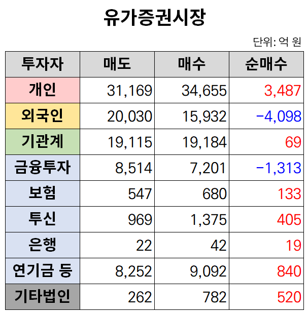 반면 개인과 기관은 각각 3487억 원, 69억 원어치를 순매도했다. 기관 중에서는 금융투자가 홀로 1313억 원어치를 팔아치운 가운데, 연기금 등(840억 원)과 투신(405억 원), 보험(133억 원) 등 대부분 매수세를 보였다.