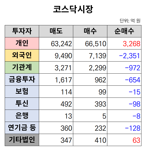 이날 외국인은 2351억 원어치를 팔아치웠다. 기관도 972억 원어치를 순매도하며 매도세에 동참했다. 반면 개인은 홀로 3268억 원어치를 사들였다.