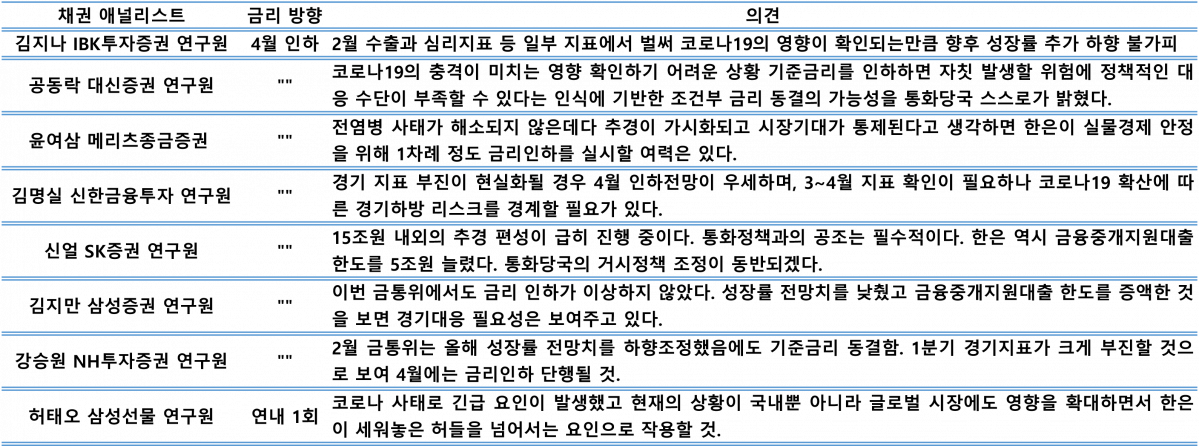 금통위 직후 증권사 8곳이 발표한 보고서를 보면 국내 주요증권사 채권 전문가들은 한은이 다가오는 4월 금통위에서 기준금리를 현 1.25%에서 1.00%로 추가 인하할 것을 전망했다. 한은은 추가 금리 인하 가능성에 선을 그었지만, ‘코로나19’ 영향으로 경기지표 등이 부진을 겪을 것이 분명하다는 이유에서다.