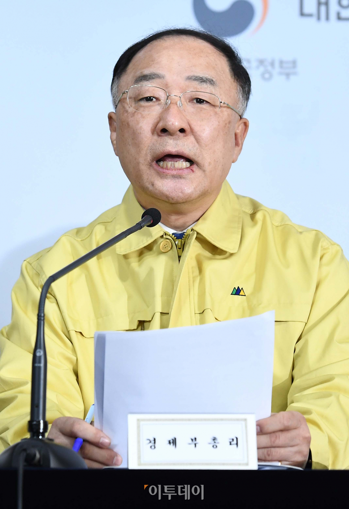 홍남기 부총리 겸 기획재정부 장관이 27일 서울 종로구 정부서울청사에서 마스크 수급 안정관련 브리핑을 갖고 있다.
