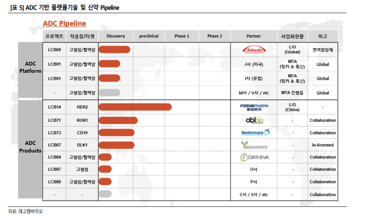 하 연구원은 “여기에다 현재 보유중인 ADC Pipeline 중에서 공동파트너와 개발 중인 ADC플랫폼기술을 보면 첫째, 다케다와 파트너로 개발중인 LCB69(고형암/혈액암)이 있고, L/O을 통해서 새로운 파트너를 찾고 있는 LCB91(고형암/혈액암, 미국 J사), LCB91(고형암/혈액암, 유럽 I사)가 있고, 또 다른 고형암/혈액암(M사)에 대해서 MTA, 플랫폼(V사)에 대해 기술이전이 추진 중”이라고 설명했다.