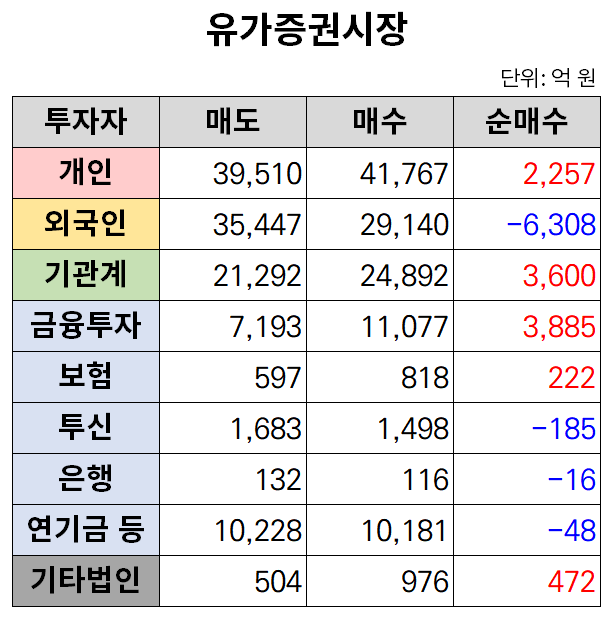 반면 개인과 기관은 각각 2257억 원, 3885억 원어치를 순매수하며 물량을 받아냈다. 기관 중에서는 금융투자가 3885억 원, 보험이 222억 원어치를 사들였다. 반면 투신과 연기금 등은 각각 185억 원, 48억 원어치를 팔아치웠다.