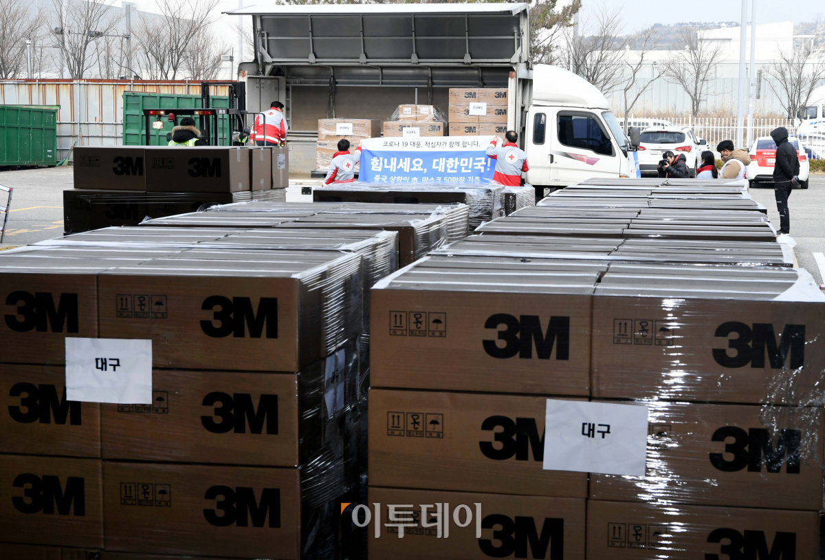 3일 인천 중구 인천국제공항 인근 한진 물류창고에서 대한적십자사 관계자들이 중국 상하이시가 국내 신종 코로나바이러스 감염증(코로나19) 확산 방지를 위해 기증한 마스크 50만 개를 트럭에 싣고 있다. 상하이시가 기증한 마스크는 의료용 마스크 10만 장과 일회용 마스크 40만 장 등 총 50만 장이며, 상하이시가 지정한 대구와 경북, 부산, 전북 등 지자체로 전달된다.