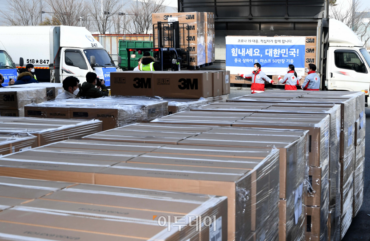 3일 인천 중구 인천국제공항 인근 한진 물류창고에서 대한적십자사 관계자들이 중국 상하이시가 국내 신종 코로나바이러스 감염증(코로나19) 확산 방지를 위해 기증한 마스크 50만 개를 트럭에 싣고 있다. 상하이시가 기증한 마스크는 의료용 마스크 10만 장과 일회용 마스크 40만 장 등 총 50만 장이며, 상하이시가 지정한 대구와 경북, 부산, 전북 등 지자체로 전달된다.