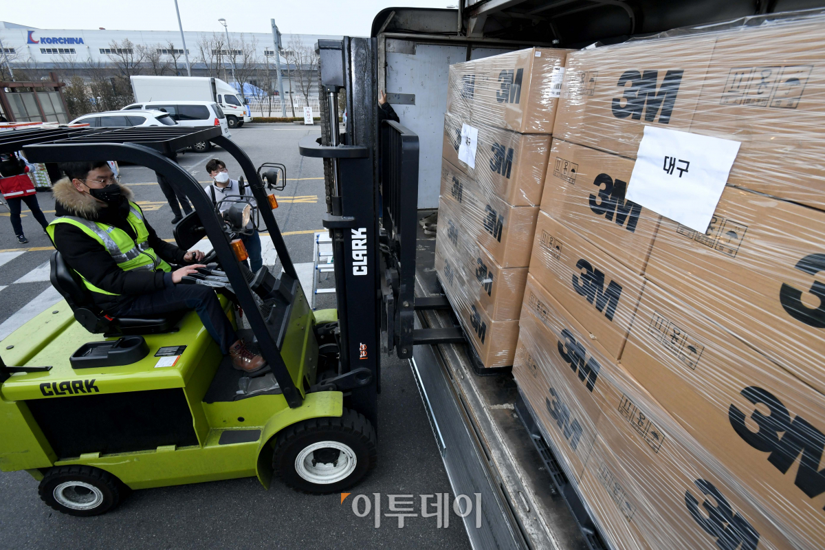 3일 인천 중구 인천국제공항 인근 한진 물류창고에서 대한적십자사 관계자들이 중국 상하이시가 국내 신종 코로나바이러스 감염증(코로나19) 확산 방지를 위해 기증한 마스크 50만 개를 트럭에 싣고 있다. 상하이시가 기증한 마스크는 의료용 마스크 10만 장과 일회용 마스크 40만 장 등 총 50만 장이며, 상하이시가 지정한 대구와 경북, 부산, 전북 등 지자체로 전달된다.