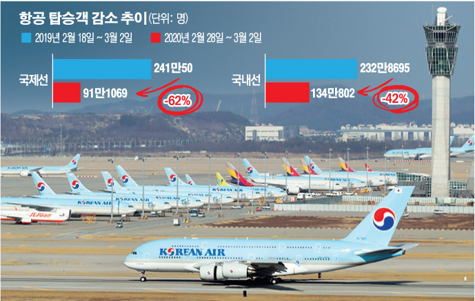 지난달 18일 신종 코로나바이러스 감염증(코로나19) ‘수퍼 전파자’로 알려진 31번 확진자 발생 이후 단 2주만에 급감한 항공 탑승객 수다.