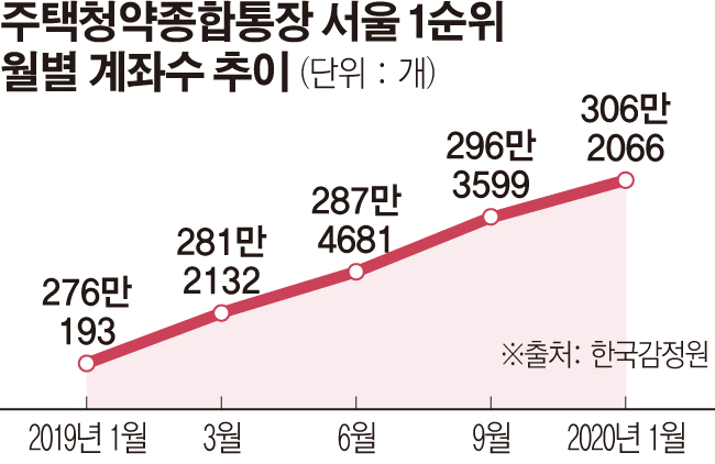 3일 한국감정원 청약홈에 따르면 올해 1월 말 기준 주택청약종합저축 가입자 중 서울 1순위 청약 자격을 얻은 사람은 306만2066명에 달했다. 한 달 동안에만 1순위 청약종합저축 가입자가 무려 3만3137명 증가한 것이다. 최근 1년 동안 월별 증가폭으로는 최대치다.