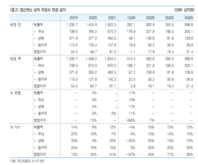 박은정 유안타증권 연구원은 “중국에서 시작된 코로나19 영향이 중국 외 유럽을 포함한 주변국으로 퍼지며 장기화 되고 있다”며 “코스맥스는 코로나19로 인해 중국 가동률이 1분기 일시적인 영향을 받았지만, 이러한 환경은 향후 코스맥스에게 기회가 될 것”이라고 전망했다.