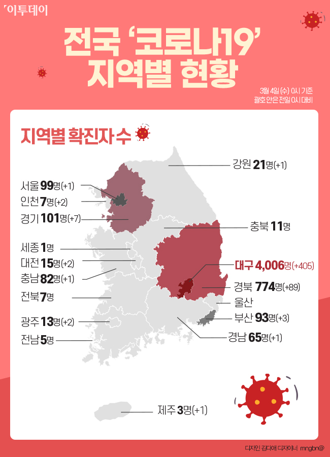 [코로나19 지역별 현황] 대구 4006명·경북 774명·경기 101명·서울 99명·부산 93명·충남 82명 순