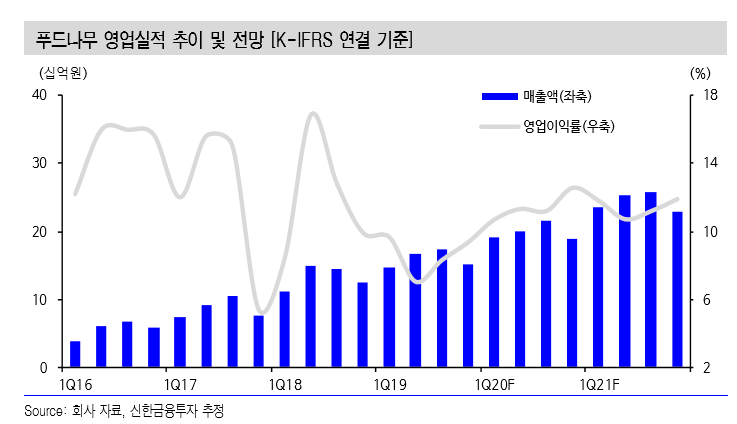 신한금융투자는 푸드나무에 대해 기대를 웃도는 성장을 보였다며 목표주가를 기존 2만2000원에서 2만5000원으로 상향했다. 투자의견은 ‘매수’를 유지했다.