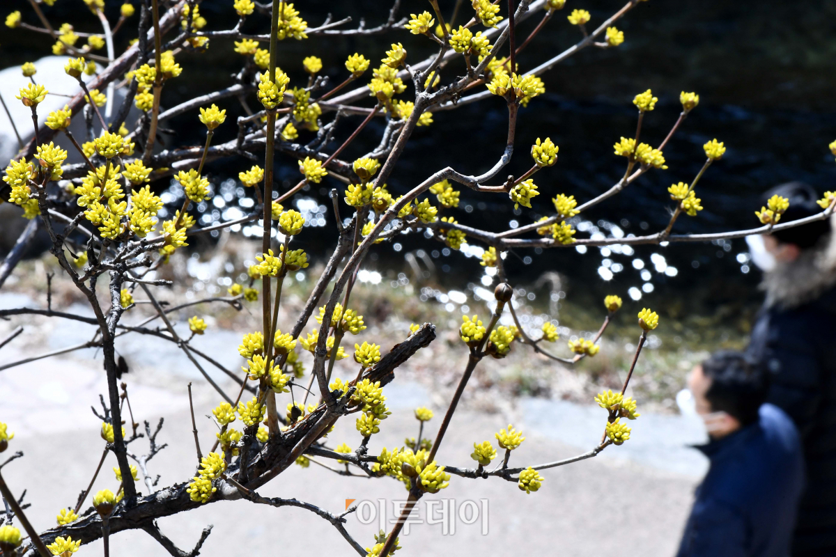 만물이 겨울잠에서 깨어난다는 절기 ‘경칩(驚蟄)’인 5일 꽃샘추위가 찾아왔음에도 서울 종로구 청계천에 꽃망울을 터뜨린 산수유가 봄소식을 전하고 있다.