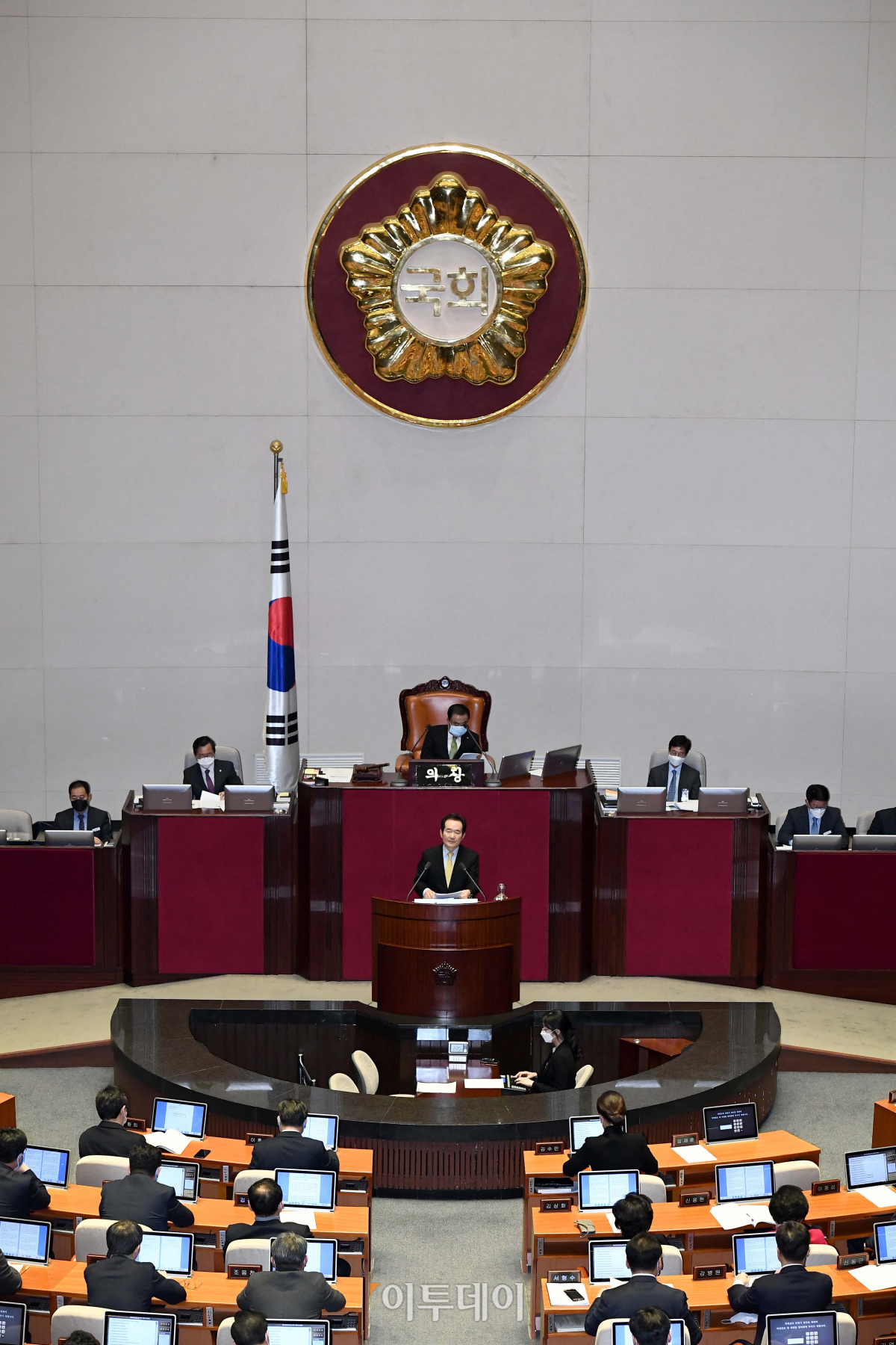 정세균 국무총리가 5일 서울 여의도 국회에서 열린 본회의에서 신종 코로나바이러스 감염증(코로나19) 관련 추가경정예산안 시정연설을 하고 있다.