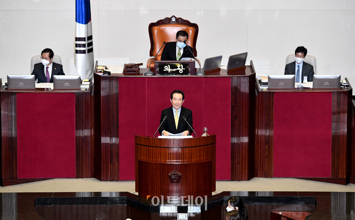 정세균 국무총리가 5일 서울 여의도 국회에서 열린 본회의에서 신종 코로나바이러스 감염증(코로나19) 관련 추가경정예산안 시정연설을 하고 있다.