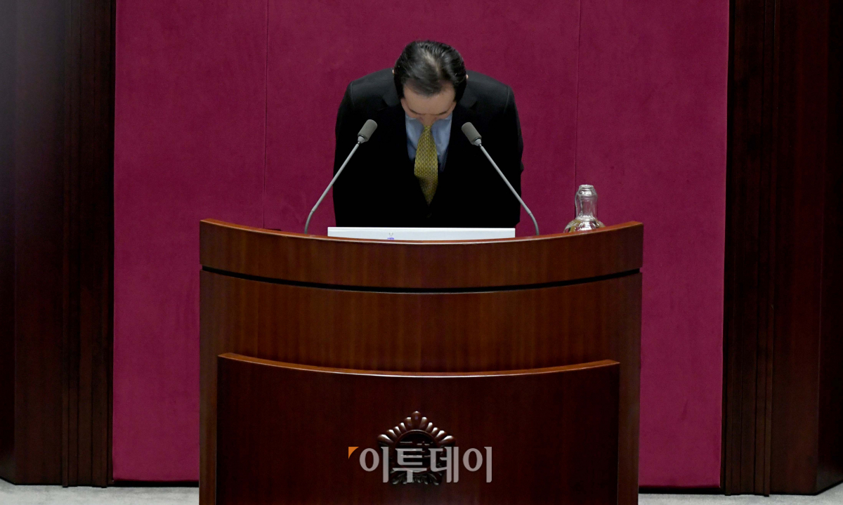 정세균 국무총리가 5일 서울 여의도 국회에서 열린 본회의에서 신종 코로나바이러스 감염증(코로나19) 관련 추가경정예산안 시정연설을 마친 뒤 인사하고 있다.