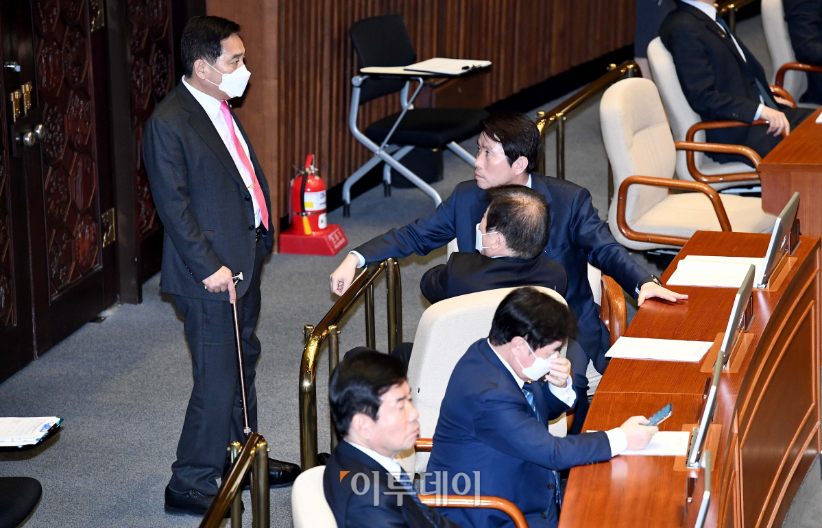5일 서울 여의도 국회에서 열린 본회의에서 인터넷전문은행 설립 및 운영에 관한 특례법 일부개정법률안이 부결되자 이인영 더불어민주당 원내대표와 심재철 미래통합당 원내대표 등이 대화하고 있다.