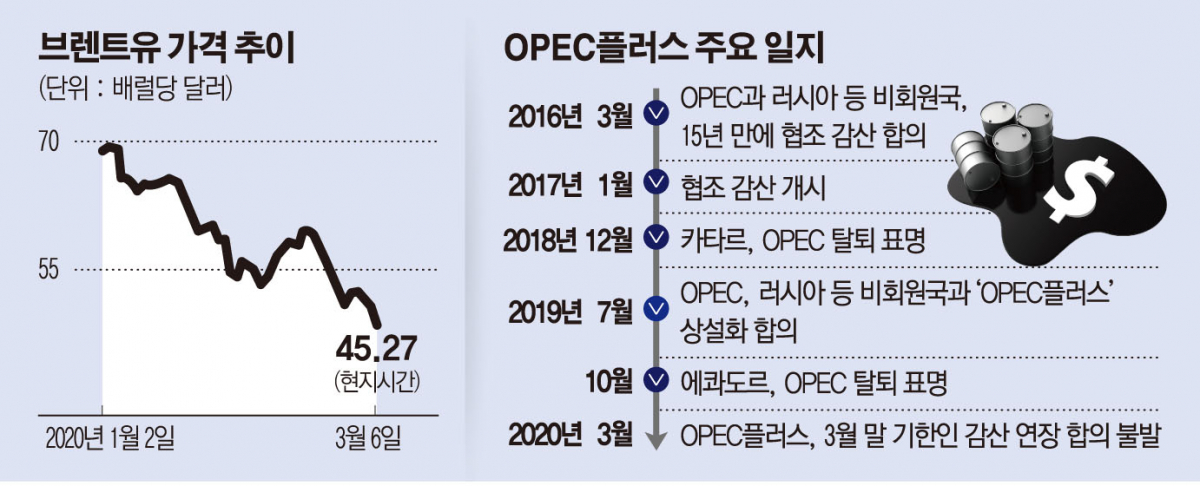 코로나19에 따른 투자 심리 위축으로 국제유가가 계속 급락하는 가운데, 지난 6일(현지시간) 오스트리아 빈에서 열린 OPEC플러스(석유수출국기구 회원국과 주요 10개 산유국 연합) 장관급 회의에서는 감산 규모 확대 등 현안에 대해 의견 일치를 보지 못했다. OPEC 맹주인 사우디아라비아가 감산 확대를 주장했지만, 석유시장 점유율 하락을 우려하는 러시아가 반기를 들면서 합의가 불발됐다. 이에 공동 기자회견도 취소됐다.