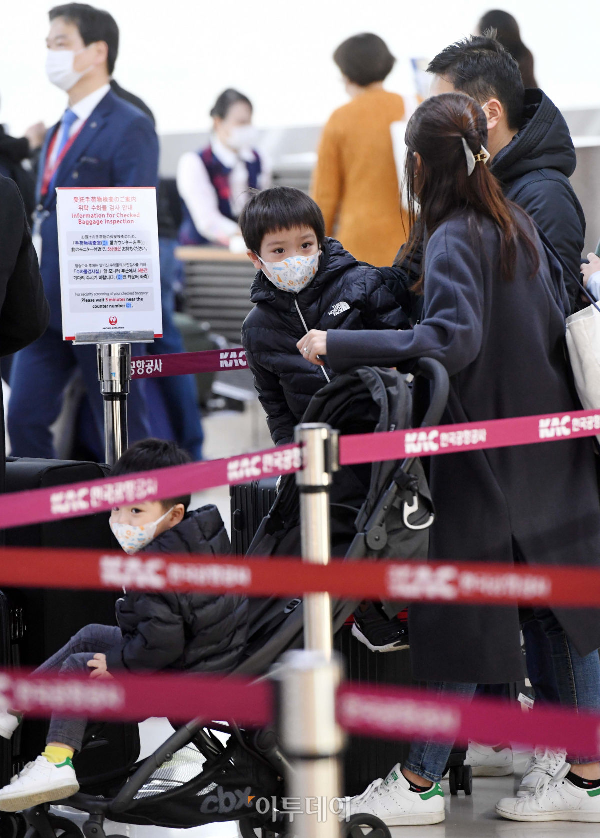 신종 코로나바이러스 감염증(코로나19) 방역을 명목으로 한 일본 정부의 한국인에 대한 입국 제한 조치 시행을 하루 앞둔 8일 서울 강서구 김포국제공항 출국장 일본행 카운터에서 승객들이 탑승 수속을 밟고 있다. 정부는 일본의 우리 국민에 대한 입국 제한 대응으로 9일 0시부터 일본에 대한 비자 면제조치와 이미 발급된 비자의 효력을 정지한다고 밝혔다.