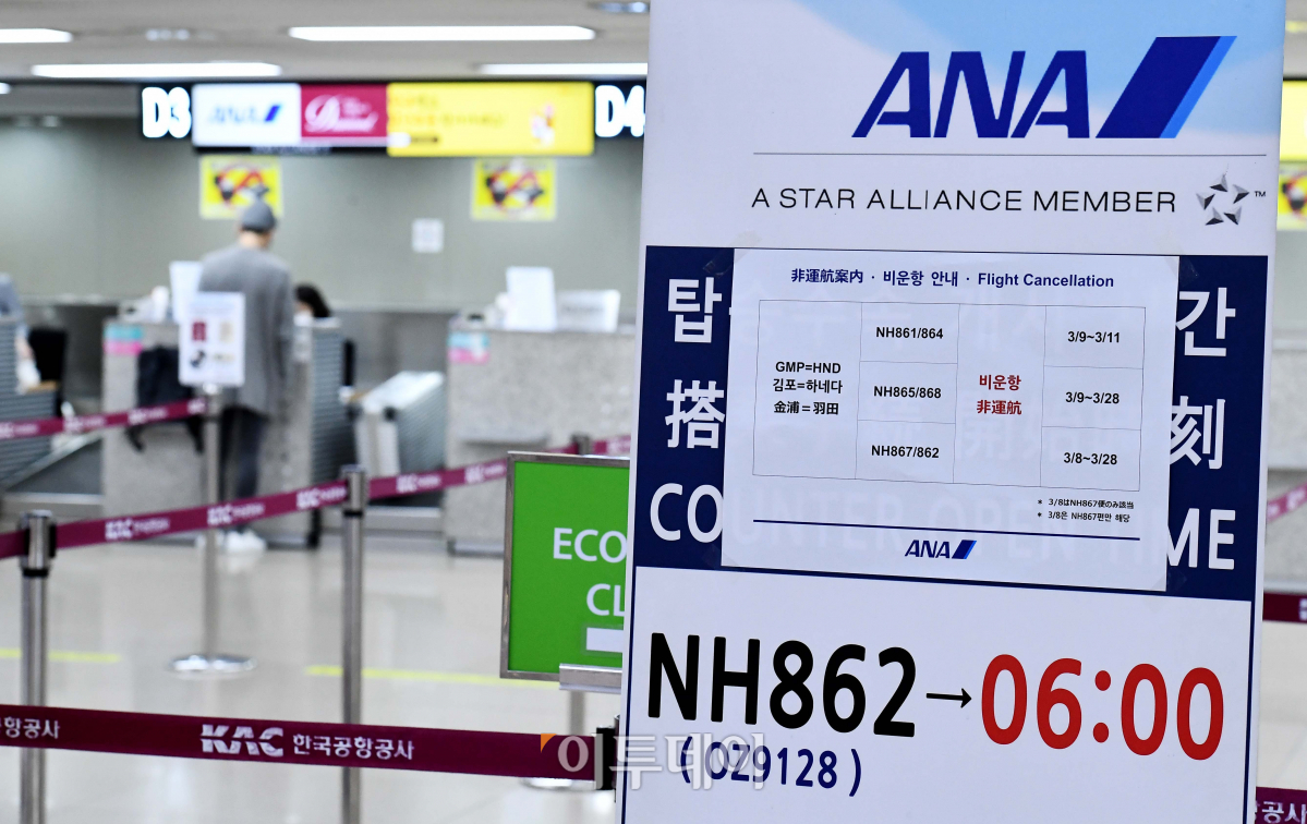 신종 코로나바이러스 감염증(코로나19) 방역을 명목으로 한 일본 정부의 한국인에 대한 입국 제한 조치 시행을 하루 앞둔 8일 서울 강서구 김포국제공항 출국장 카운터 앞에 일본 입국제한 안내문이 설치돼 있다. 정부는 일본의 우리 국민에 대한 입국 제한 대응으로 9일 0시부터 일본에 대한 비자 면제조치와 이미 발급된 비자의 효력을 정지한다고 밝혔다.