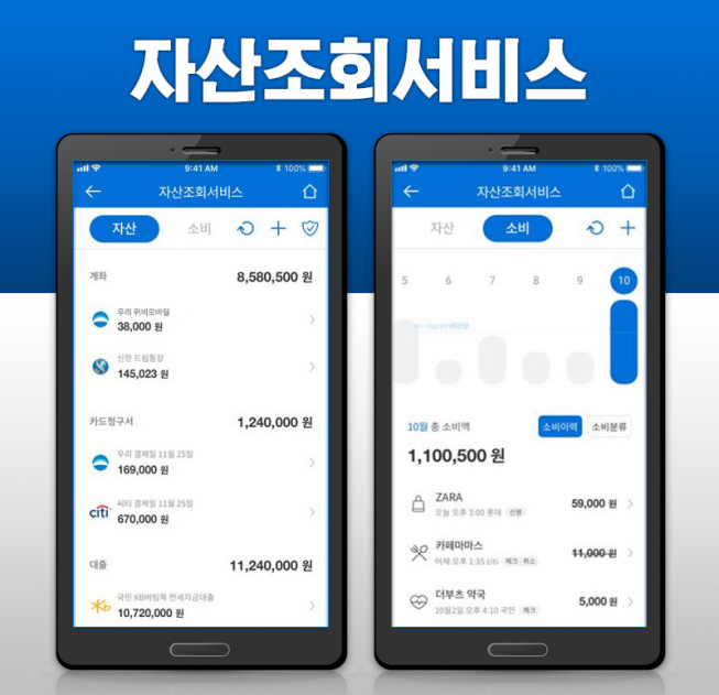 이 서비스는 여러 금융기관의 자산과 부채, 수입과 지출 정보를 한 번에 제공한다. 메뉴는 자산과 소비 화면으로 각각 구분돼 있다. 자산메뉴를 통해 은행별 계좌 잔액 및 이체내용과 금융사별 대출 이용금액, 카드사별 카드청구서 조회 등을 확인할 수 있다.