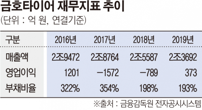 금호타이어는 2015년 이래로 매출액 3조 원을 회복하지 못했다. 연결기준 매출액은 2015년 3조404억 원→2016년 2조9472억 원→2018년 2조5587억 원→2019년 2조3692억 원으로 매년 감소세다.