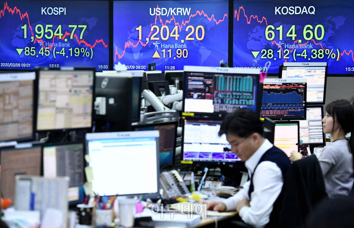 신종 코로나바이러스 감염증(코로나19) 전세계 확산 공포에 코스피가 4% 넘게 폭락했다. 9일 서울 중구 하나은행 딜링룸 전광판에 코스피 지수가 전 거래일보다 85.45포인트(4.19%) 내린 1954.77을 가리키고 있다. 신태현 기자 holjjak@