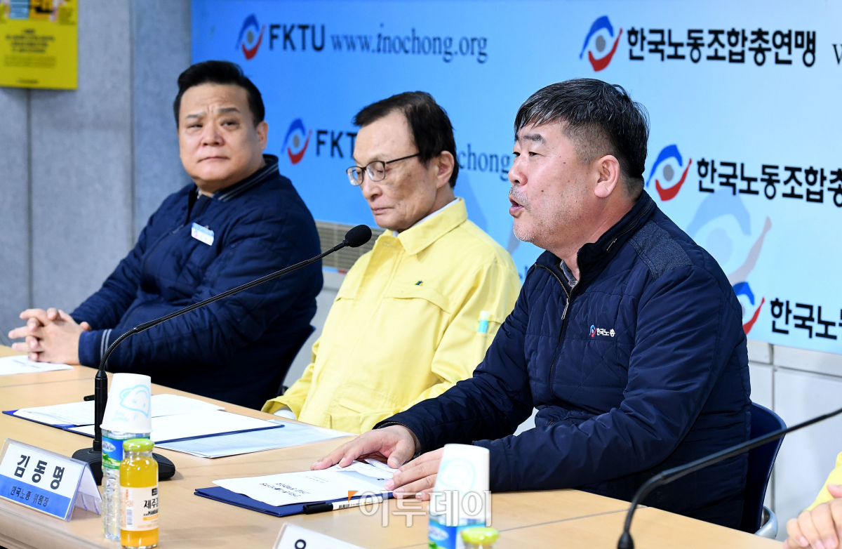 김동명 한국노동조합총연맹 위원장이 10일 서울 여의도 한국노총에서 열린 더불어민주당-한국노동조합총연맹 고위급 정책협의회에서 모두발언을 하고 있다.