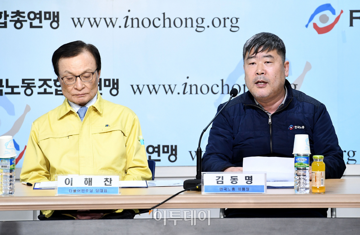 김동명 한국노동조합총연맹 위원장이 10일 서울 여의도 한국노총에서 열린 더불어민주당-한국노동조합총연맹 고위급 정책협의회에서 모두발언을 하고 있다.