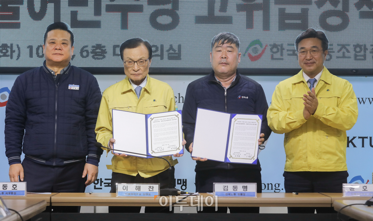 이해찬 더불어민주당 대표와 김동명 한국노동조합총연맹 위원장이 10일 서울 여의도 한국노총에서 열린 더불어민주당-한국노동조합총연맹 고위급 정책협의회에서 노동존중 협약서에 서명한 뒤 기념촬영을 하고 있다.