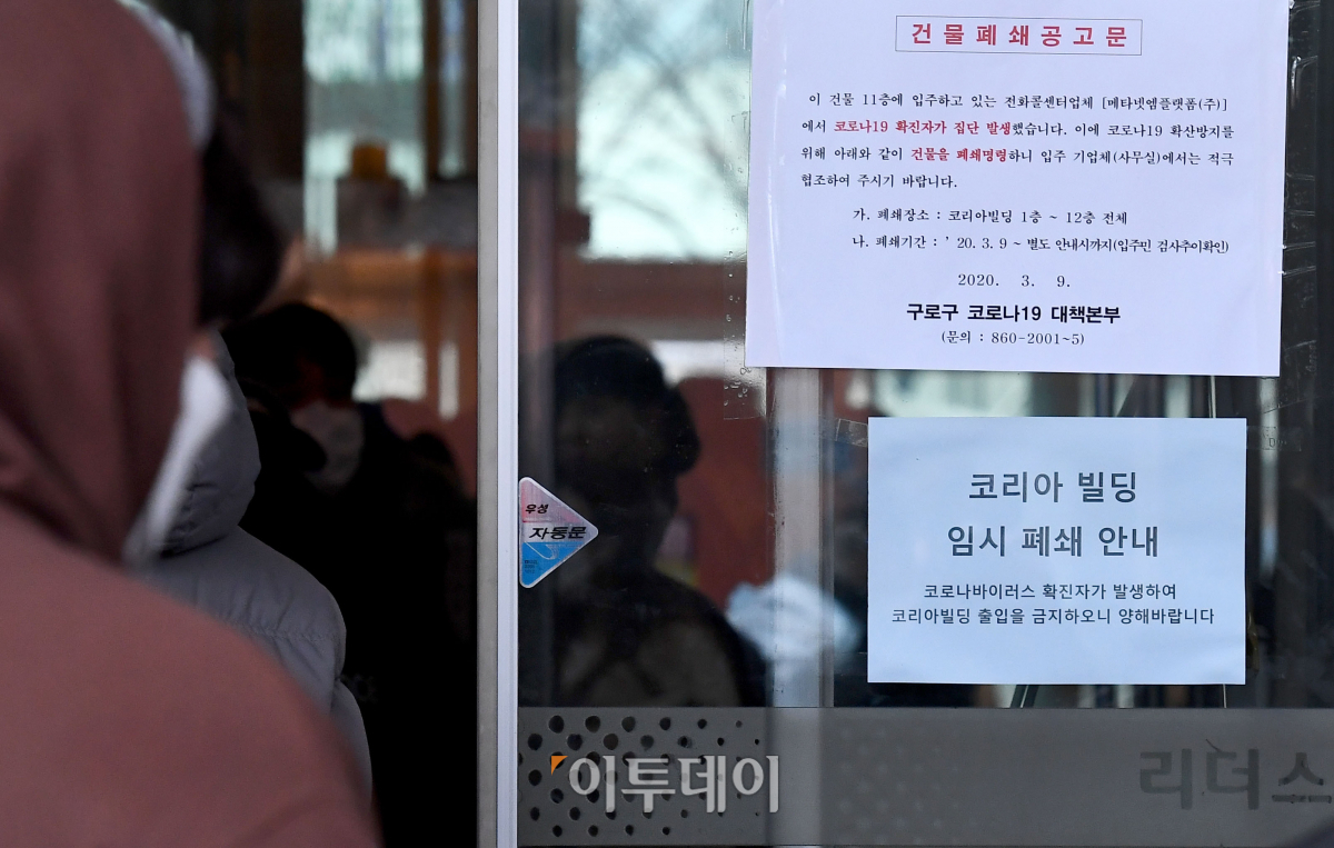 서울 구로구 신도림동 코리아빌딩 11층 콜센터에서 신종 코로나바이러스 감염증(코로나19) 집단 감염으로 최소 30명 이상의 확진자가 발생했다. 이는 서울에서 발생한 최대규모 집단 감염이다. 10일 코리아빌딩 앞에 건물폐쇄 안내문이 붙어 있다. 신태현 기자 holjjak@